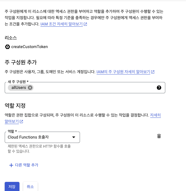 3.์ฐ์ธก์ ์๋ "์ฃผ ๊ตฌ์ฑ์ ์ถ๊ฐ" ๋ฒํผ์ ๋๋ฅธ ํ "์ฃผ ๊ตฌ์ฑ์ ์ถ๊ฐ"์๋ "allUsers"๋ฅผ ์ ๋ ฅํ๊ณ "์ญํ ์ง์ ์์๋ "Cloud Functions ํธ์ถ์ "๋ฅผ ์ ํํ๋ค.